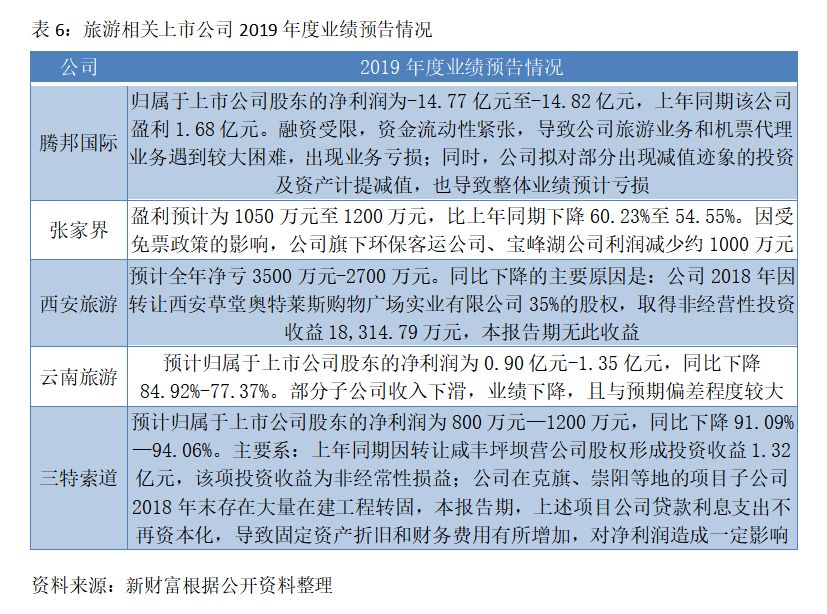 今年以来,包括西安旅游、张家界(000430)、云南旅游、腾邦国际(300178)、三特索道(002159)等企业已纷纷发布2019年度业绩下滑或亏损公告(表6)。整体看,景区企业业绩受损的主要原因在于门票价格的下调,而旅行社、代理供应商等则在于竞争加剧、资金流动性紧张等,此次疫情无疑加重了这类企业的经营风险。上述企业2月3日至13日间平均跌幅达-5.01%%,跑输上证综指。