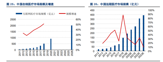 根据弗若斯特沙利文报告,在线医疗行业中国市场规模达到491亿元,2020年预计接近千亿,保守预测2026年达到2000亿元,远程医疗方面,2018年我国远程医疗市场规模130亿元,未来五年符合增长率均为27.63%,2022年将达到345亿元。