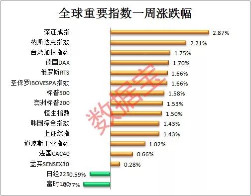 近一周,全球重要指数涨多跌少。数据宝统计显示,深证成指涨幅最大,为2.87%,英国富时100指数、日本日经225指数是唯二下跌的指数,分别下跌0.77%、0.59%。美股三大指数涨幅不一,科技股居多的纳指涨2.21%,标普500指涨1.58%,道指涨1.02%。大宗商品上,美国WTI原油累涨3.4%,COMEX黄金期货主力合约涨0.86%。