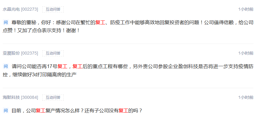 回到资本市场上来,除了关注每日的疫情数据外,上市公司乃至各行各业的企业复工情况如何,也成了投资者们关注的重点所在。就近期交易所互动平台情况来看,投资者排队“喊话”上市公司复工,已经成为日常。