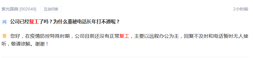 此外,也有投资者吐槽董秘电话“常年打不通”。对此,紫光国微解释称:在疫情防控特殊时期,公司目前还没有正常复工,主要以远程办公为主,回复不及时和电话暂时无人接听,敬请谅解。
