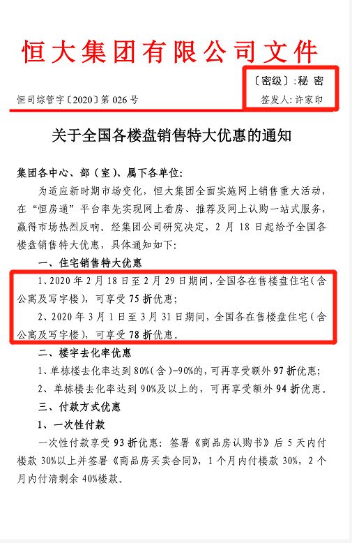 这封“秘密文件”由许家印签发,文件名为《关于全国各楼盘特大优惠通知》,通知显示: