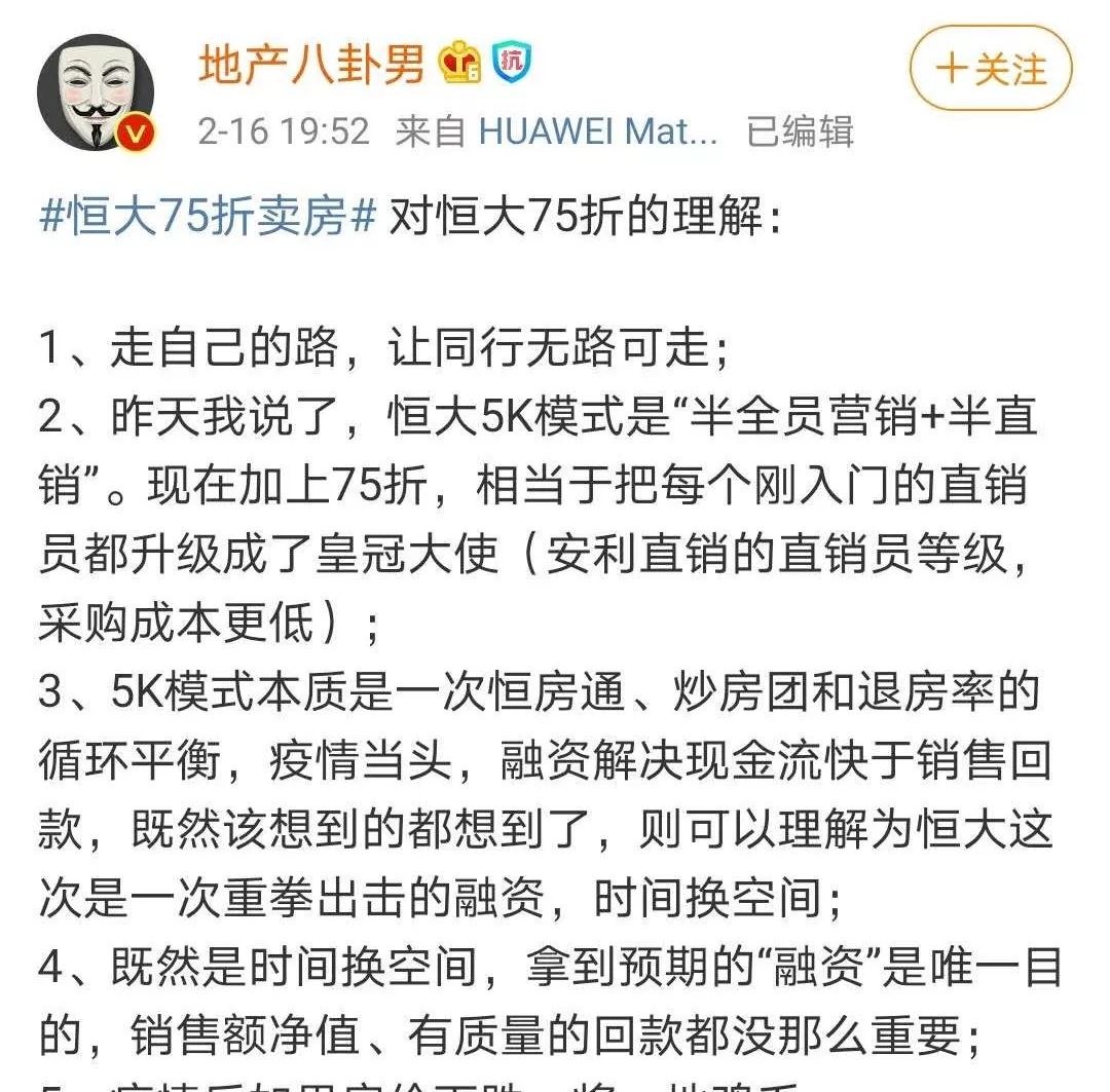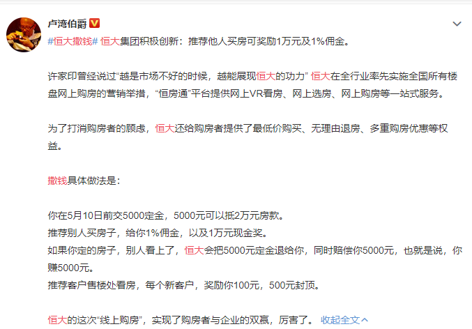 对此,有大V表示,恒大的这次“线上购房”,实现了购房者与企业的双赢。