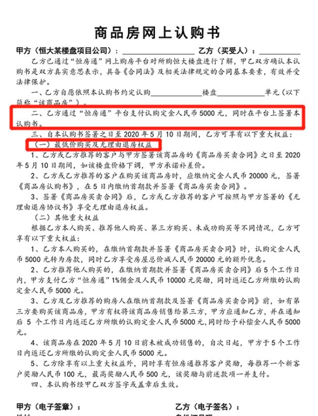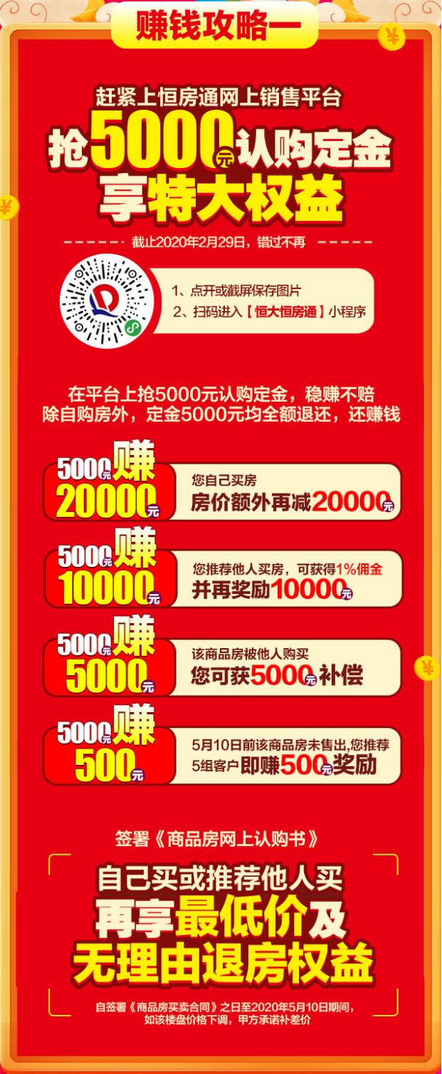 为了彻底打消购房者对线上购房的疑虑,恒大同时给出了最低价购房和无理由退房的“双保险”,进一步增强其购房信心。