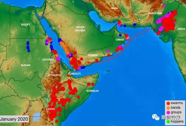 据了解,2019年1月,沙漠蝗群从苏丹和厄立特里亚飞越红海,2月到达也门、沙特阿拉伯和伊朗,于3月到达巴基斯坦西南部,6月到达中北部,对上述国家造成严重危害并积累了较高的虫源。受雨量充沛和季风时间长等因素影响,当前东非、西亚及南亚国家正遭遇历史罕见的蝗虫灾害,索马里、巴基斯坦等多国宣布进入紧急状态,应对蝗虫灾害。