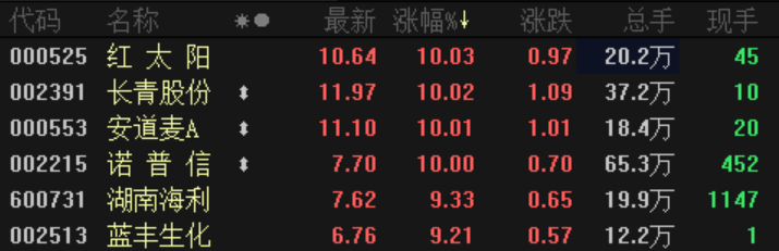 17日A股上午开盘后,化药板块瞬间大涨!红太阳、长青股份、安道麦A、诺普信涨停;扬农化工、利尔化学、海利尔、新安股份等均大幅上涨。