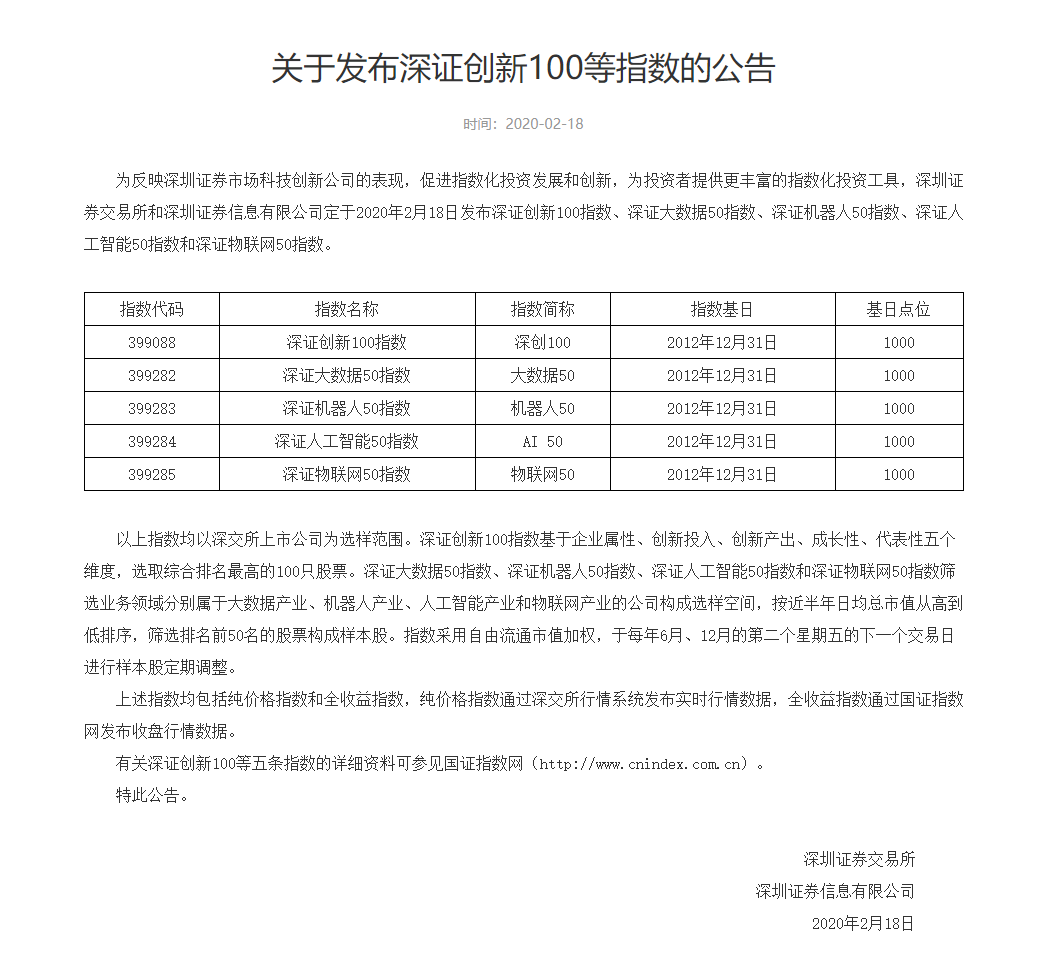 2月18日,深交所发布深证创新100等五大指数,涵盖科技创新宽基指数以及科技细分行业指数。具体看包括深证创新100指数(深创100)、深证大数据50指数(大数据50)、深证机器人50指数(机器人50)、深证人工智能50指数(AI50)和深证物联网50指数(物联网50)。