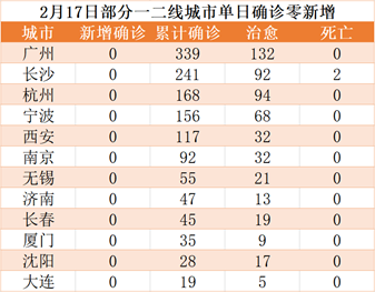 实际上,从最新公布的数据看,2月17日,包括广州、西安、杭州、宁波、南京、厦门、济南、长春、沈阳、大连、长沙、无锡在内多个一二线城市实现当日零新增的情况,这也意味着各地防疫措施已经取得阶段性成果。