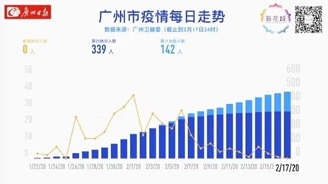 截至2月17日24时,广州市累计报告新冠肺炎确诊病例339例,现有疑似病例0例;累计核实追踪密切接触者3540人,尚在医学观察834人。其中,339例确诊病例中,累计治愈出院142例,无死亡病例。现有197例在定点医院隔离治疗。
