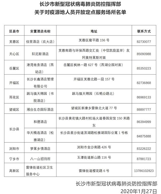为了防止输入性病例的增加,解决疫源区人员在长沙病源追踪及隔离工作,1月27日,长沙对疫源地人员开放定点服务场所。按照要求,长沙高新区管委会和各区县市政府制定防控工作方案,对湖北省来长人员,在排查无发热、咳嗽等疑似症状后,各区县市给予适当帮助,统一征用酒店,统一进行医学观察和隔离。