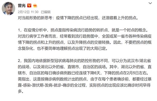 此前,曾光也曾公开发表示,疫情下降的拐点已经出现,但还潜藏着上升的拐点。曾光在微博中预测说,在下降拐点之后,还难以避免又出现一个疫情上升的拐点。理由是,切不可以低估多达1.6亿人口流动返程潮对疫情的负面影响,首当其冲的是对珠三角、长三角、京津冀地区的冲击作用。