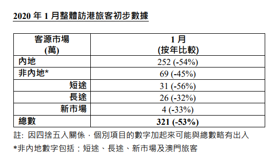 受去年密集暴力示威活动和近期新冠肺炎疫情影响,香港旅游发展局公布的最新数据显示,2020年1月访港人次约320万,同比下跌53%,2月最新数据显示单日访港旅客人次跌至低于3000。数据显示,1月内地访港旅客人次约252万,同比下跌54%,非内地访港旅客人次约69万,同比下跌44%。