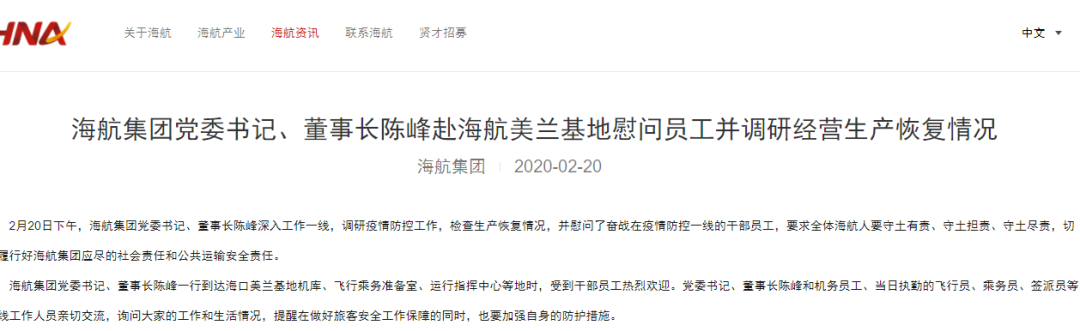 不过,截至记者发稿,海航集团官网也并未发布相关澄清公告,而是更新了一则资讯,显示海航集团党委书记、董事长陈峰2月20日下午赴海航美兰基地慰问员工并调研经营生产恢复情况,并慰问了奋战在疫情防控一线的干部员工。