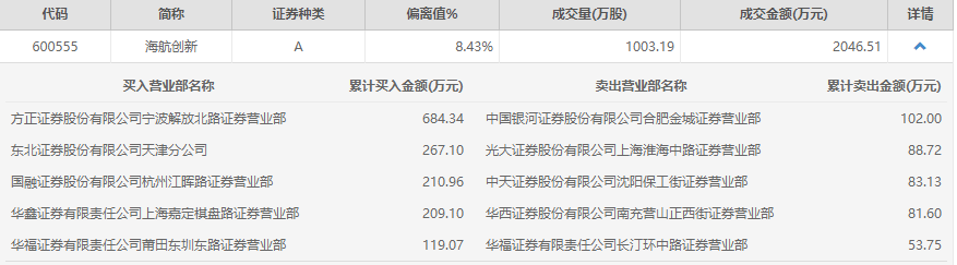根据登上龙虎榜的海航创新盘后数据显示,买卖前五名均是券商营业部席位,且金额并不大。其中,买一为“方正证券宁波解放北路营业部”,买入金额为684.34万元;卖一为“银河证券合肥金城营业部”,卖出102万元。