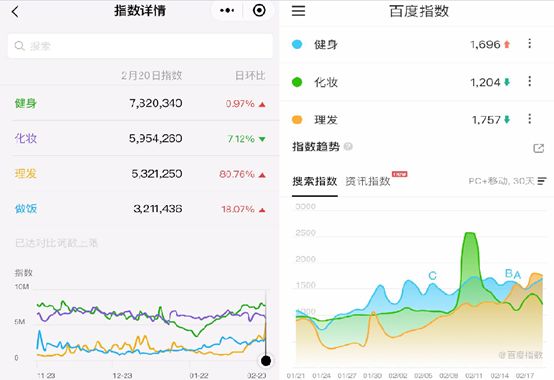 五花八门的上榜物品乍看让人意料不到,但仔细一想却在情理之中,较为真实地反映了近来众人的生活状态。微信指数和百度指数都显示,“做饭”、“健身”、“化妆”、“做饭”是目前全国人民宅在家中几大热衷的事。
