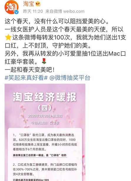 其二是随着疫情有所好转,各地复工安排上了日程。根据淘宝2月20日最新发布的经济暖报,女性同胞们已开始为复工准备起来,口红成为复工潮硬通货,热门品牌口红的增幅普遍都在300%-700%之间,其中网红色号更是疯狂补货4次全部售罄。“口罩妆”更是取代口罩,成为春天最热消费选项。美妆博主们复工后的第一桶金,大多都是“口罩妆”给的。