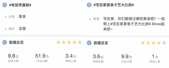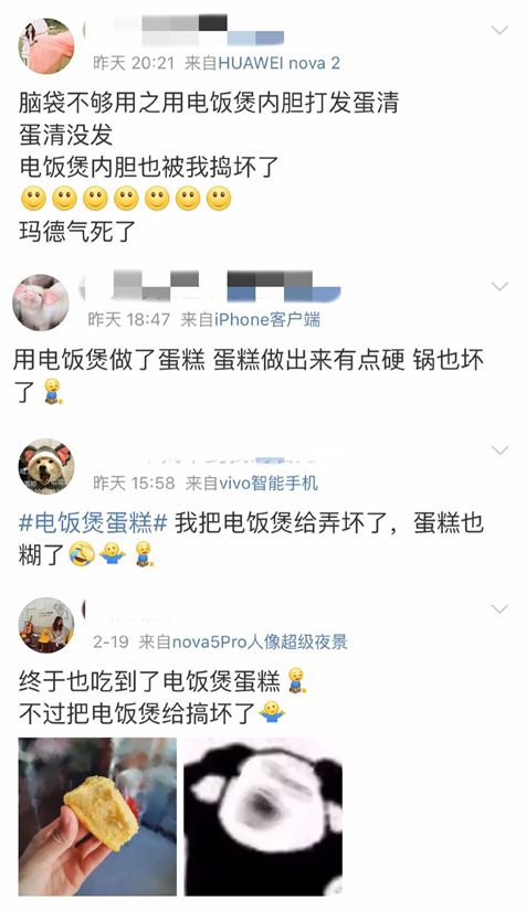 由于不少火锅、烤串、奶茶店都没有恢复营业,对美食心急难耐的吃货们纷纷在家修炼厨艺。微博上各种美食相关话题频频上榜,网友自发参与起了“宅在家美食才艺大比拼”,纷纷晒出自己的厨艺大作;抖音、快手、B站上各类美食教程也是层出不穷。例如最近十分火热的“电饭煲蛋糕”更是直接掀起了打蛋器的热销狂潮。