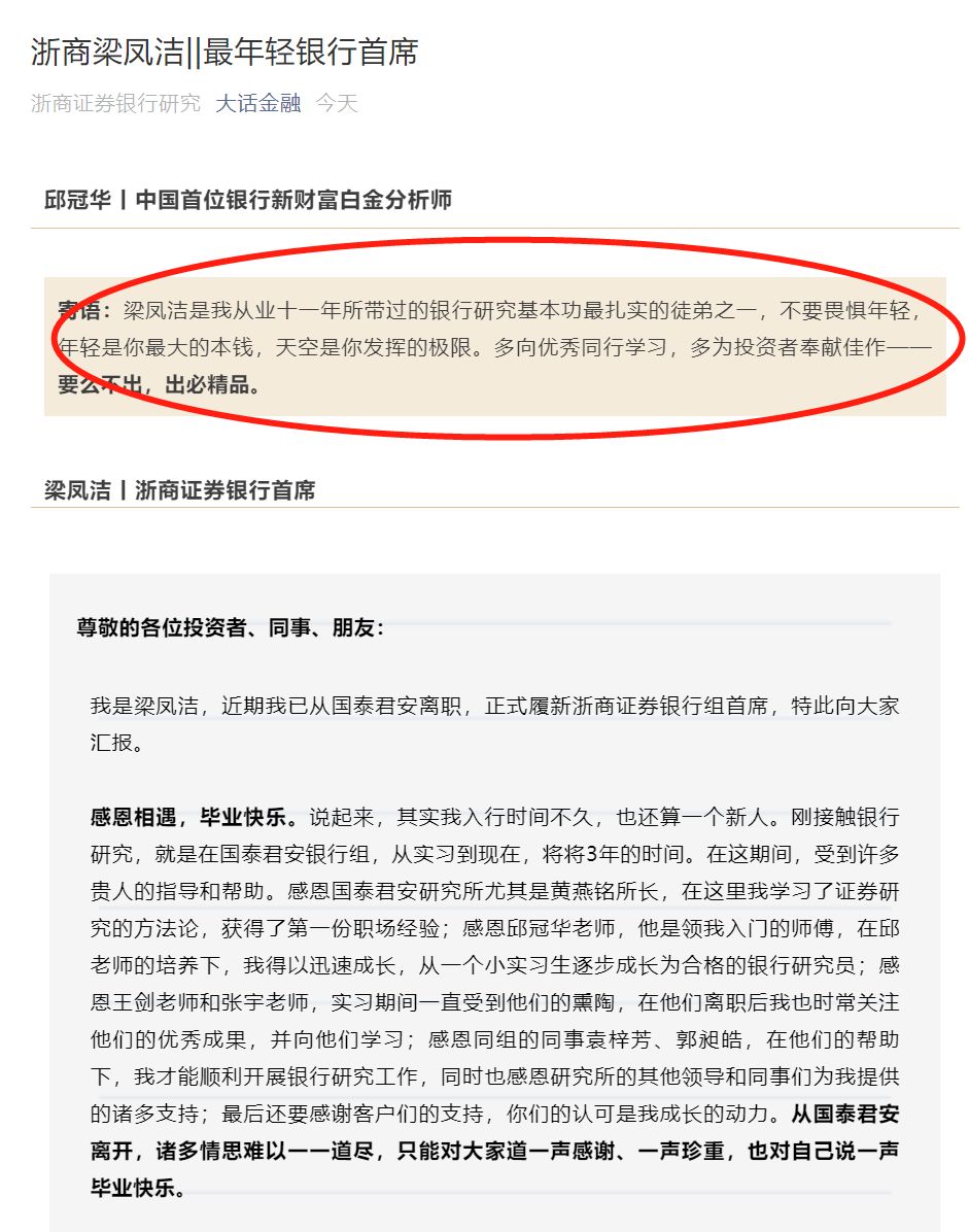 他在寄语中写道,“梁凤洁是我从业十一年所带过的银行研究基本功最扎实的徒弟之一,不要畏惧年轻,年轻是你最大的本钱,天空是你发挥的极限。多向优秀同行学习,多为投资者奉献佳作——要么不出,出必精品。”