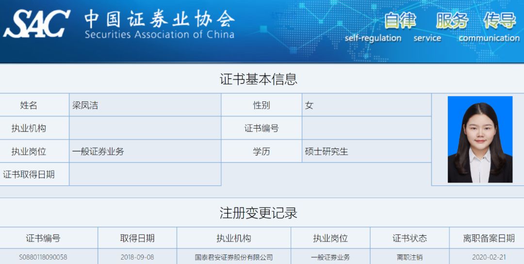 券商中国记者查询到,梁凤洁于2017年进入国泰君安研究所实习,2018年7月研究生毕业后正式入职。她在国泰君安的最后一篇报告于2019年12月发表,报告中以研究助理的身份署名。