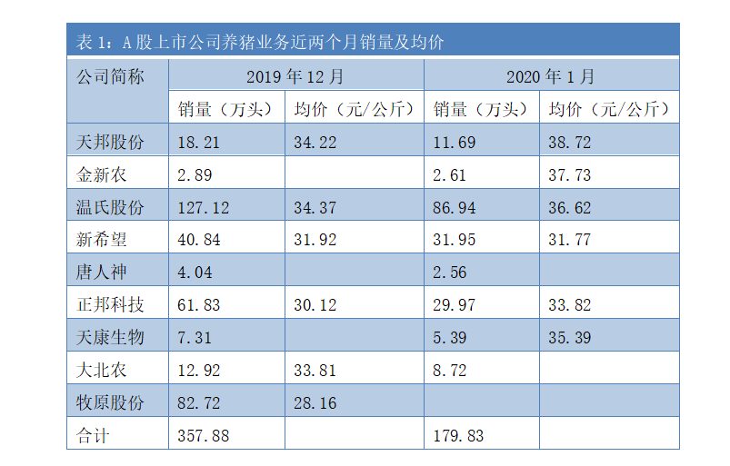 因为我们长期形成的食用活鲜肉品的习惯,我国肉禽市场呈现“国家储备+民营大型企业规模养殖+小型分散养殖占主流”的格局。疫情影响下,占主流的小型分散养殖受冲击严重,中央储备肉不断投放市场,如向武汉定点投放2000吨储备冻肉,2月14日向市场投放1.4万吨中央储备猪肉,平抑猪价波动。加上大型企业货源充足(表1),保证了春节前后市场的猪肉供需平衡。因此,疫情之下,我们仍餐餐有肉。