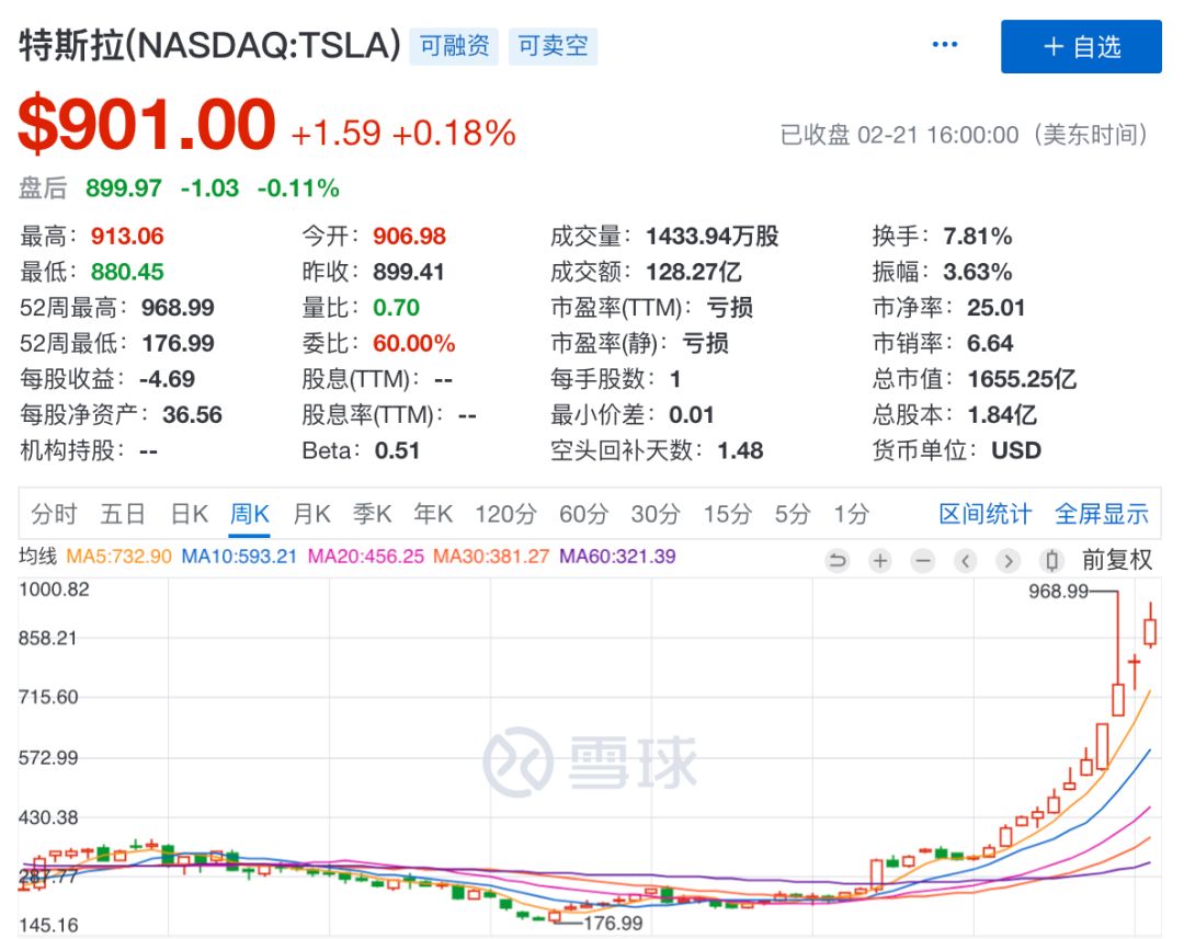 截至美国时间2月21日盘后,特斯拉报901美元/股,这一价格已较其年初的424.50美元/股翻倍。特斯拉已超过大众成为仅次于丰田的全球市值第二高车企。
