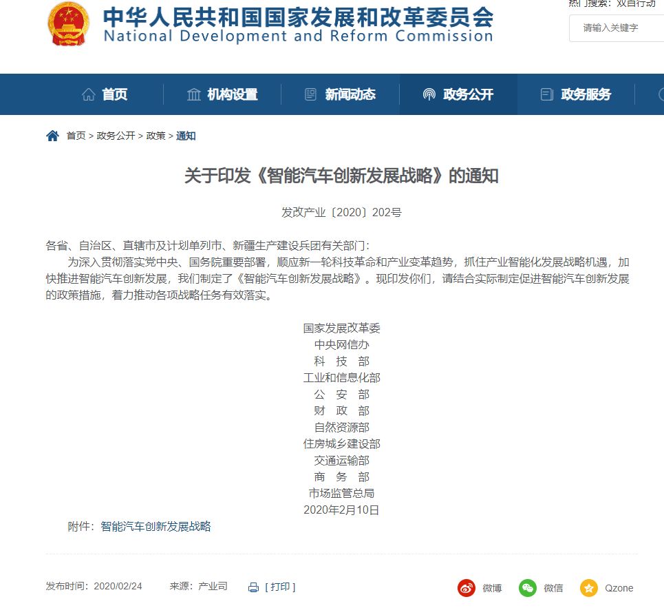 2月24日,国家发展改革委网站正式发布“关于印发《智能汽车创新发展战略》的通知”。《智能汽车创新发展战略》指出,智能汽车已成为全球汽车产业发展的战略方向。