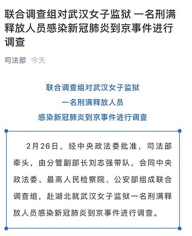 27日,经中央政法委批准,司法部牵头,会同中央政法委、最高人民检察院、公安部组成联合调查组,赴湖北就武汉女子监狱一名刑满释放人员感染新冠肺炎到京事件进行调查。