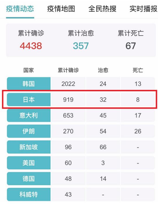 根据最新统计数据,目前除中国外,全球累计确诊新冠肺炎病例4438例,日本(含钻石公主号在内)确诊919例,确诊人数不仅接近海外总感染人数的四分之一,甚至可能马上破千。