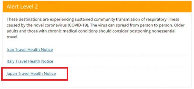 此外,根据疫情的实时进展,CDC(美国疾病控制和预防中心)也将日本的旅游警告升级为二级,认为这些地区的新冠肺炎疫情正在持续进行社区传播,建议老年人和患有慢性疾病的人推迟旅行。该组织的旅行警告共有三级,二级旅行健康警告为加强预防措施,目前被列入最高等级第三级的国家暂为中国和韩国。