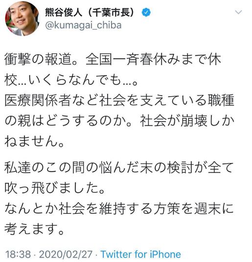 对安倍全国停课的决定,千叶市长也表示非常震惊,并在推特上提出了自己的异议:儿童感染风险低,课后学童保育也关门,低学年儿童只能一个人被孤立在家里;父母乘坐满员地铁回家,也会带回病毒,没有意义。他认为:应该企业停工,公共交通也拿出对策,之后才是学校停课。