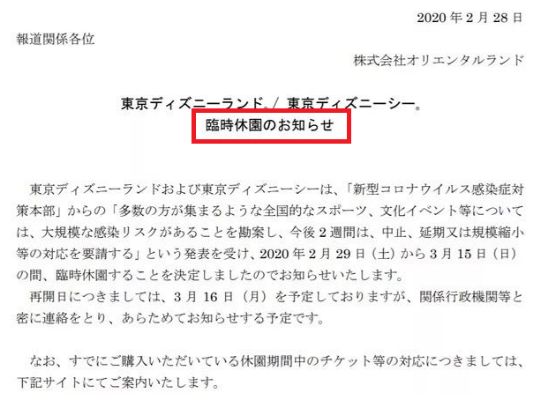 今日(2月28日),日本东京迪士尼也宣布,按照日本政府抗击新冠肺炎的相关要求,将从2月29日起临时闭园,且不早于3月15日开放,开园日期在3月16日另行通知。这是全球第三家因新冠疫情关闭的迪士尼乐园,上海和香港的迪士尼目前也处于闭园状态。