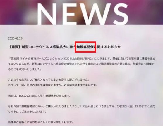 原定于2月29日举行、目前已售出约1.2万张门票的,日本国内最大的时尚活动“东京女孩展演2020春夏场”,也将采用首次无观众形式完成演出。不少日本网友纷纷表示松了一口气。