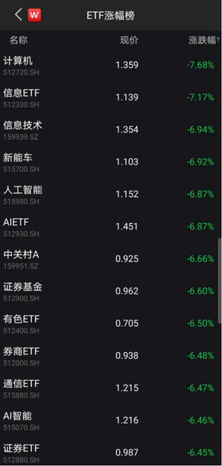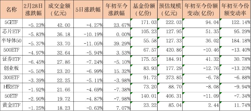 截至2月28日收盘,上证综指大跌3.71%,ETF涨跌幅榜上,计算机、人工智能等跌幅居前。5G、芯片、半导体等主题ETF继续深度回调,跌幅均在5%以上。