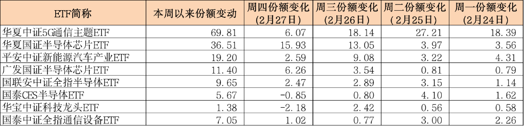 Wind统计数据显示,截至2月27日,本周以来,5GETF的份额增长了69.81亿份,芯片ETF的份额增长了36.51亿份,新能车ETF份额增长了19.2亿份。四个交易日中,仅有半导体50ETF、科技ETF的份额在2月27日出现了小幅缩水。