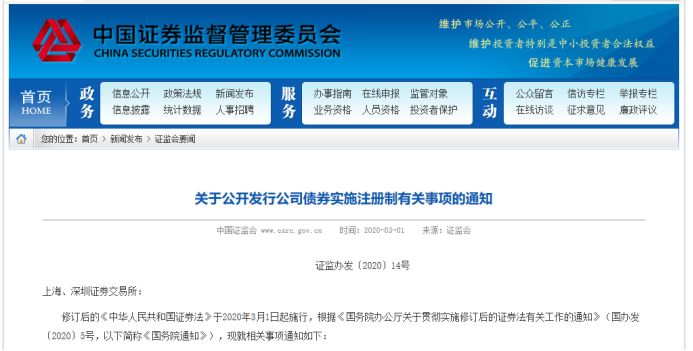 同日,证监会也发布《关于公开发行公司债券实施注册制有关事项的通知》,明确3月1日起,公司债券公开发行实行注册制。