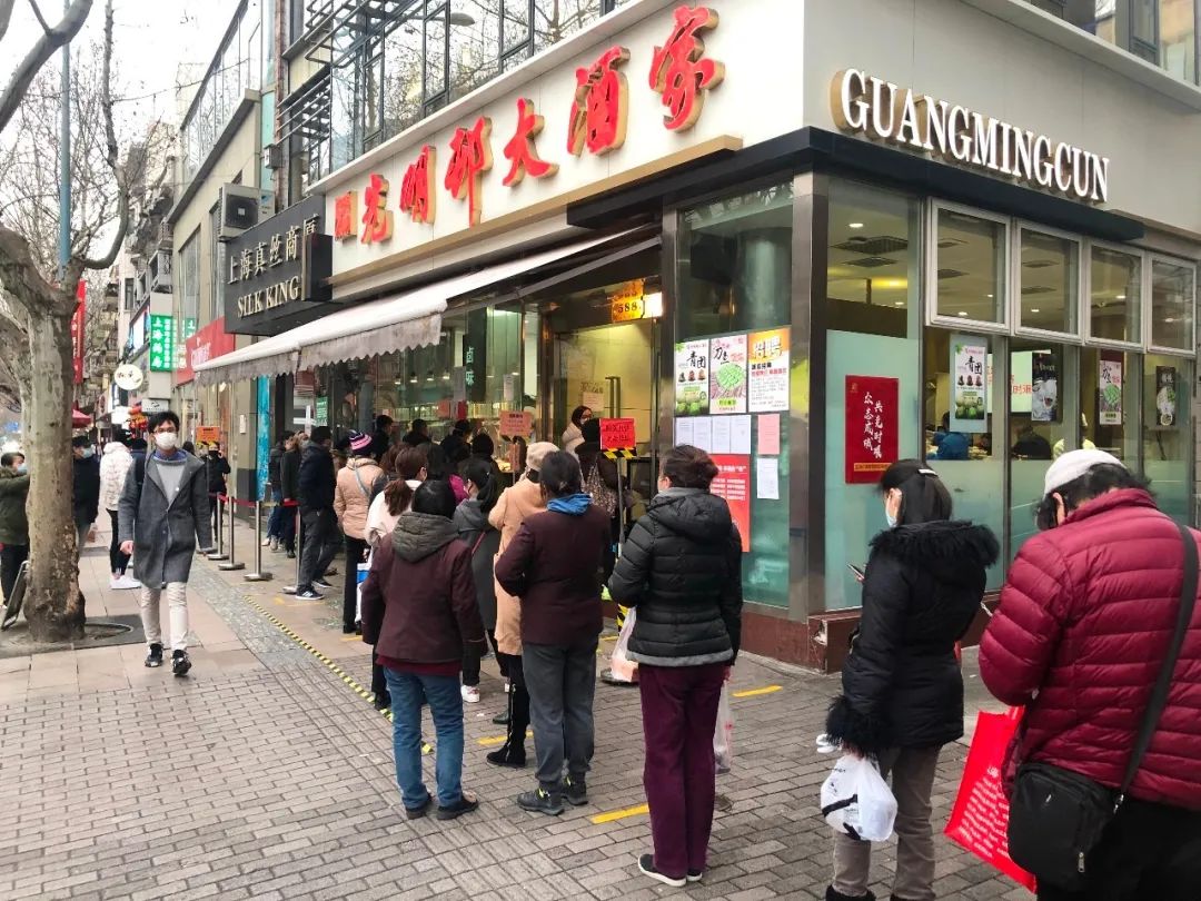 光明邨大酒店是淮海集团旗下老字号餐饮之一,淮海集团董事长孙忠明在上海市政府新闻发布会上说:“现在排长队,对于商家来说,心态是矛盾的。做商业的看到客流本来应该是高兴的,但在目前这个特殊时期,我们不敢太高兴。”