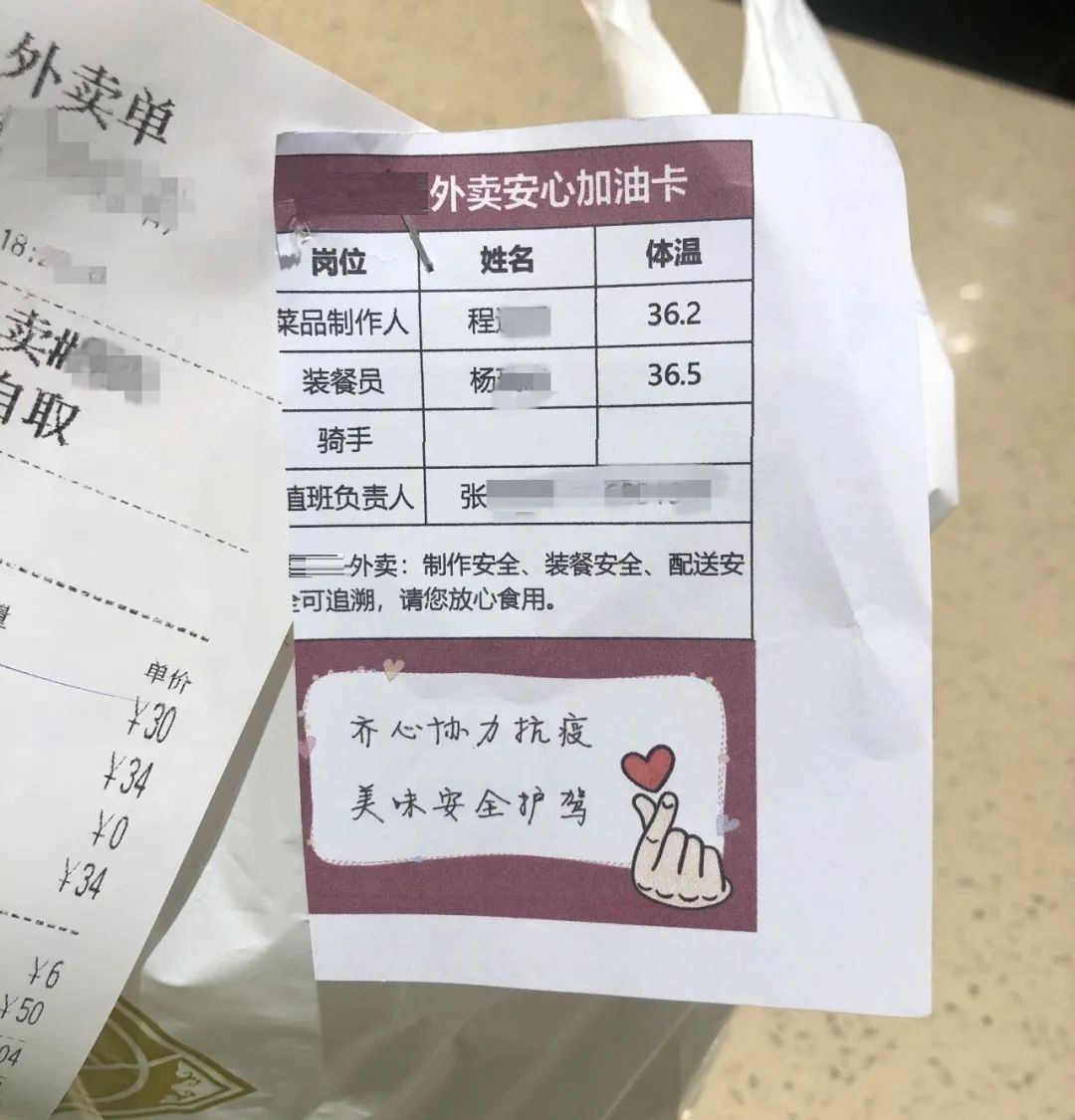 ▲每份订单上都有这种“安心卡”,标明流程各环节责任人的名字和体温 摄影:吴斯洁