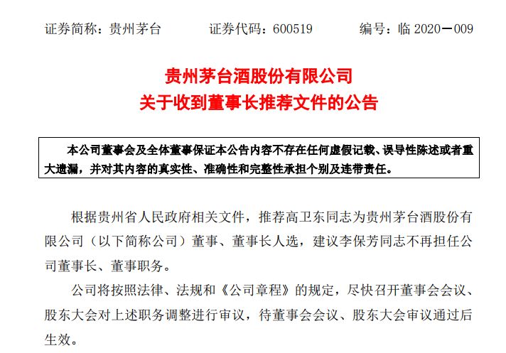 3月3日晚间,贵州茅台再现重大人事变动,根据贵州省人民政府相关文件,推荐高卫东同志为贵州茅台酒股份有限公司(以下简称公司)董事、董事长人选,建议李保芳同志不再担任公司董事长、董事职务。至此,在李保芳全面掌舵贵州茅台仅22个月后,原贵州省省委委员、贵州省交通厅厅长高卫东将成为贵州茅台新任掌舵者。
