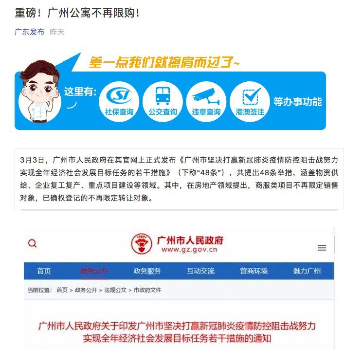 券商中国记者注意到,就连广东省人民政府新闻办公室的官微“广东发布”都转载了南方日报消息,标题为《重磅!广州公寓不再限购》的消息。