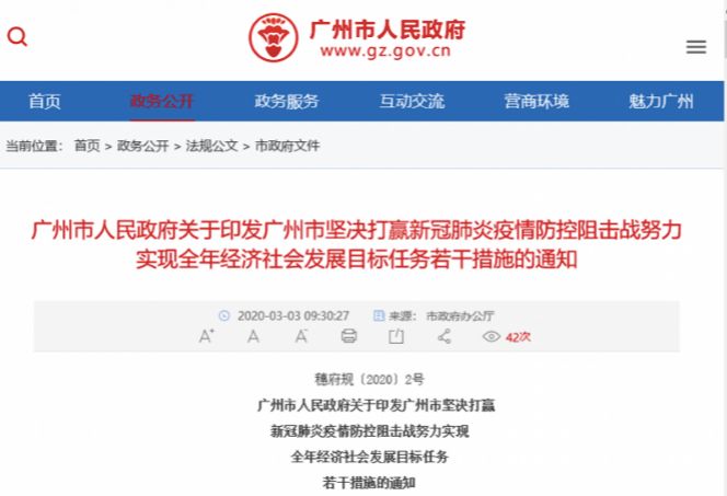 3月3日上午,广州市政府在官网发布《广州市坚决打赢新冠肺炎疫情防控阻击战努力实现全年经济社会发展目标任务的若干措施》和相关政策解读文件。