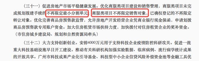 具体而言,广州的商服类项目(公寓、商铺、写字楼),不再限定最小分割单元,不再限定销售对象,也不再限定转让对象。