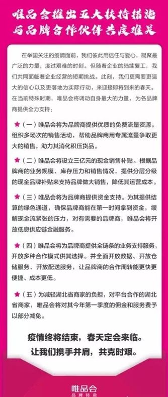 2月12日,唯品会面向全体品牌商伙伴推出了五大扶持措施,包括优质免费流量资源、三亿现金销售补贴、绿色结算通道与低息供应链金融、全链条业务支持等;尤其是针对湖北省商家,唯品会还专项推出了2020年第一季度佣金和服务费部分减免措施。