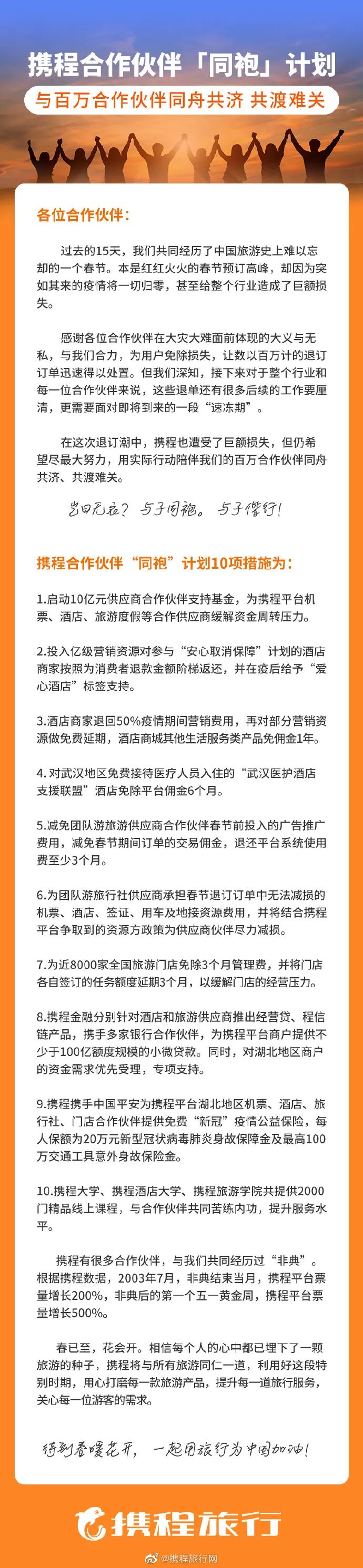 2月5日,携程向其平台上的机票、酒店、旅游度假等领域合作伙伴宣布推出“同袍”计划,包括9项具体措施,投入10亿元合作伙伴支持基金和100亿元额度小微贷款。