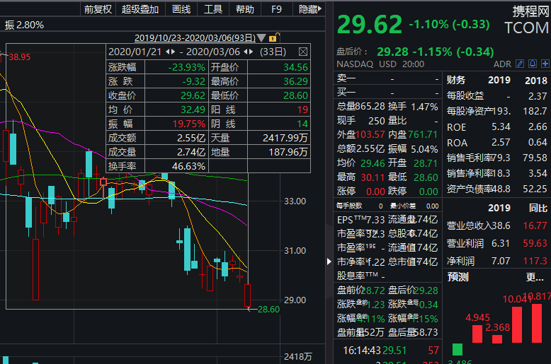 从二级市场的表现来看,在美国上市的携程,自1月21日疫情爆发以来,股价便下跌超20%。最新股价为29.62美元每股,市值174亿美元,蒸发近55亿美元(约合人民币380亿元)。