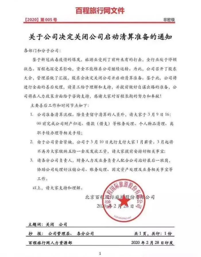 2月29日,网传一份来自百程旅行网《关于公司决定关闭公司启动清算准备的通知》。