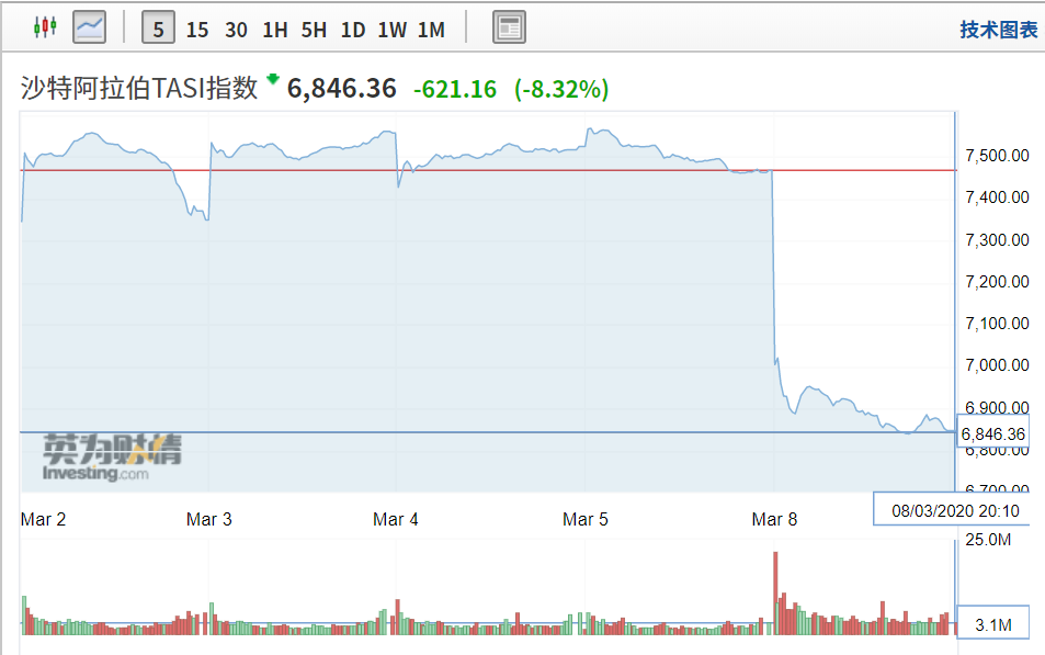3月8日,沙特股市开盘下跌7.15%,之后继续震荡下跌,截止发稿,沙特股市跌8.28%。另外,科威特股指盘中跌超10%,触发熔断。
