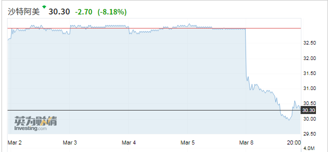 2019年12月,沙特阿美股票在沙特阿拉伯利雅得证券交易所上市,股票发行价格32里亚尔,上市之初沙特阿美股价曾一度冲高至38.70里亚尔,接着边一路震荡下跌,上一交易日(3月5日)收盘仍为33里亚尔,但3月8日沙特阿美股价直接以31.9里亚尔价格开盘,直接跌破发行价。而且之后继续下跌,截止发稿沙特阿美股价报30.10里亚尔/股,跌幅8.79%。根据wind数据,沙特阿美3月8日股价跌幅也是公司上市以来的最大跌幅。