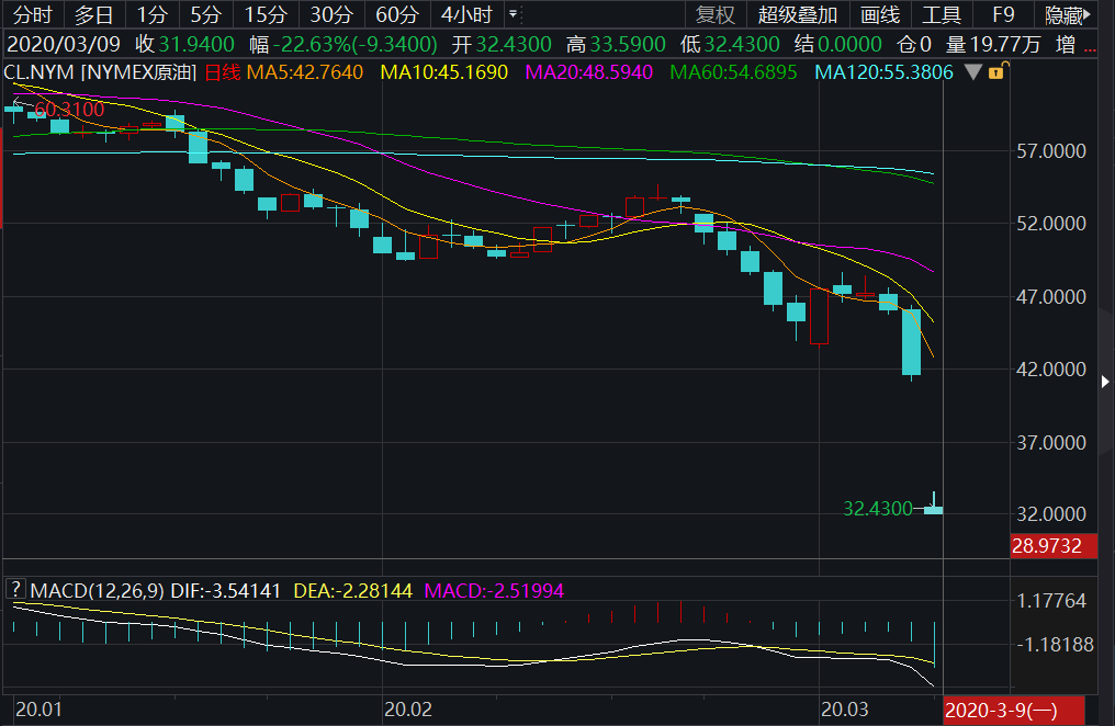 美国当地时间3月8日晚间,期货夜盘刚刚开盘就出现惊人一幕,NYMEX原油期货主力合约价格大幅低开,开盘价仅32.43美元/桶,相比前一个交易日的收盘价41.57美元/桶,跌幅达到21.99%,创下2016年2月份以来的四年新低。开盘之后,NYMEX原油价格仍在持续走低。