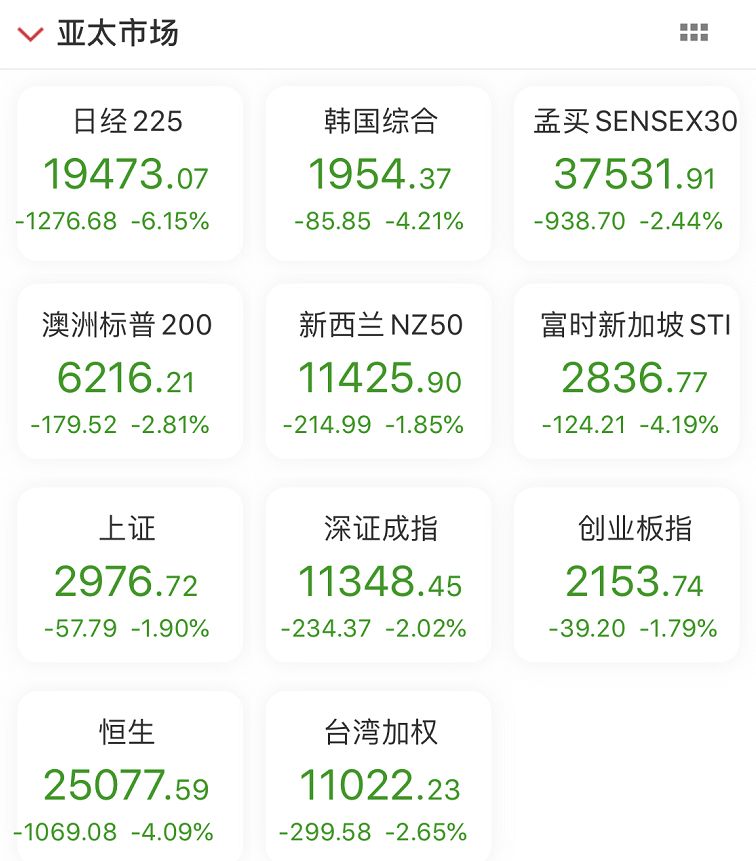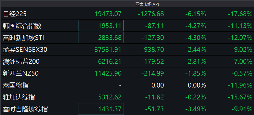 除了A股,亚太股市也持续下挫,日经225指数跌幅扩大至6.15%,韩国综合指数跌超4%,澳大利亚ASX200指数一度跌超6%,印尼雅加达综指跌0.22%,新西兰NZSE 50指数跌近2%。