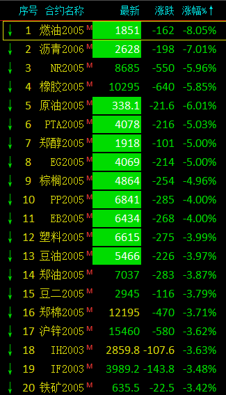 原油暴跌传导至国内期货市场,期货市场3月9日开盘集体飘绿,能源化工板块遭遇重挫,原油、燃油、沥青、PTA、甲醇、乙二醇、聚丙烯、塑料等多个品种跌停。